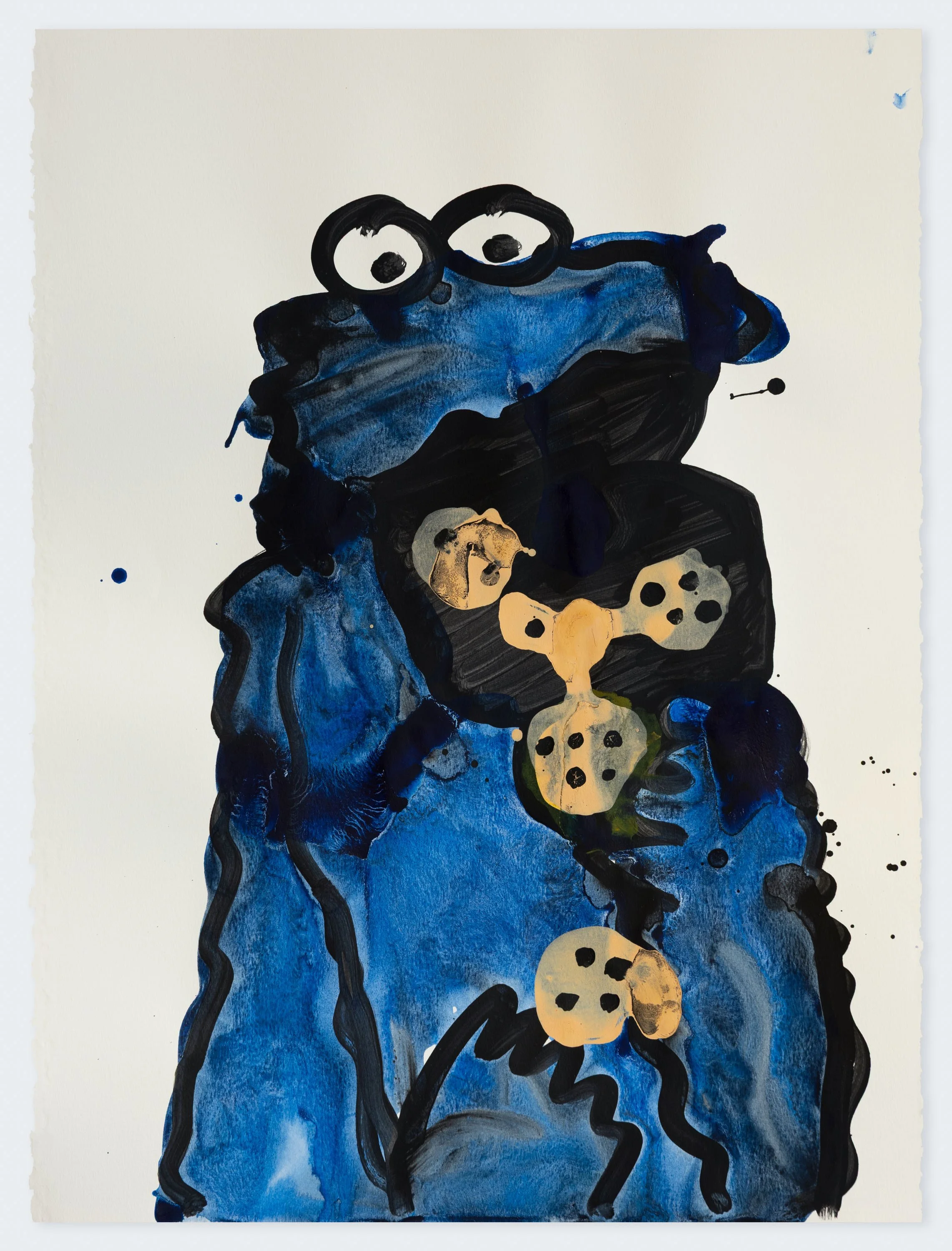 In 2025, David Zwirner presented Sidewalk Chalk, an exhibition of new paintings by American artist Katherine Bernhardt at the gallery’s 616 N Western Avenue location in Los Angeles. Featuring Bernhardt’s signature lively brushwork and vibrant palette, the works in this presentation continue to expand the artist’s unique visual lexicon, which culls from an irreverent pop vernacular as well as her own life and the broader culture. To create her works, the artist first draws on upright canvases with spray paint, after which she lays them on the floor to apply acrylic paint thinned out with water. Here she focuses on newer motifs such as Lucky Charms cereal marshmallows and sticks of butter, which are playfully combined with iconic imagery from her oeuvre, including the Sesame Street character Cookie Monster, the Pink Panther, and Garfield.