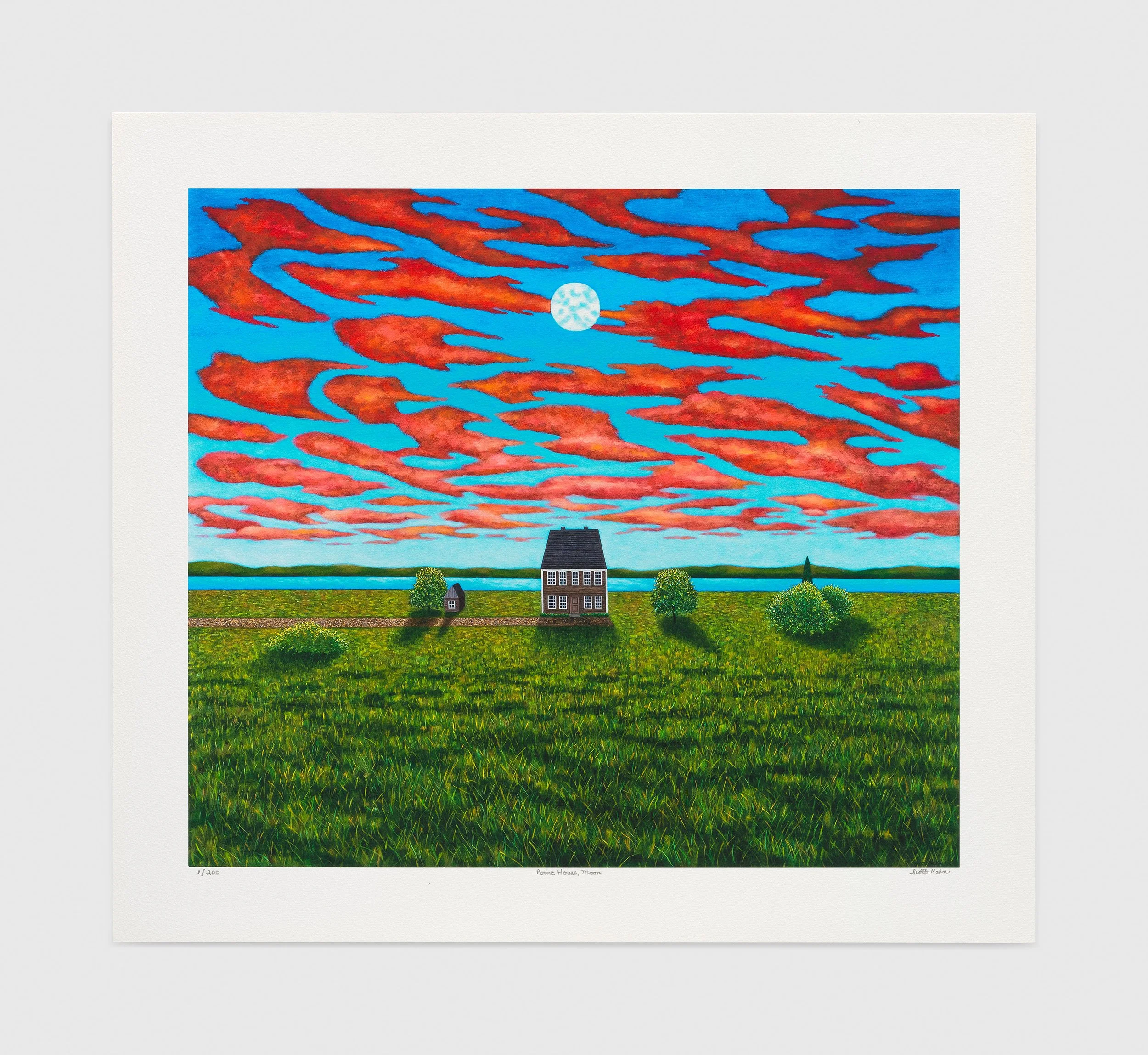 The moon appears throughout Kahn’s body of work, frequently in the background of his paintings as a sort of omen for the scene laid out beneath. Point House, Moon belongs to a group of works that focus on the full moon, with its myriad connotations, as the central compositional element.
