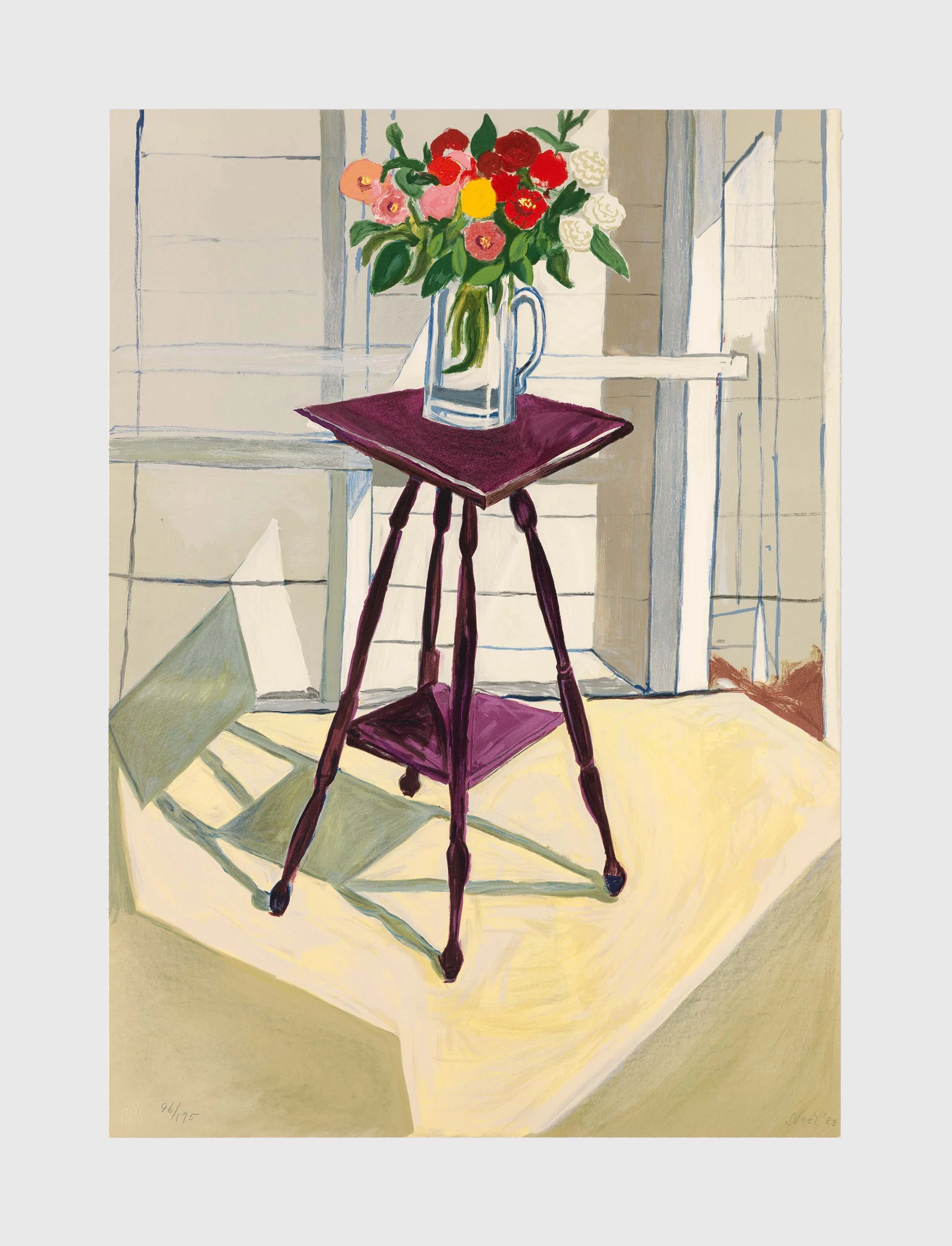 Light relates to one of Neel’s last large still lifes, made at her summer cottage in Spring Lake, New Jersey. The work demonstrates a continuing exploration of the relationship between realism and abstraction. Large areas of the composition move between two and three dimensions, and the shadow cast onto the floor and wall appears to reach out of the picture plane toward the viewer.
