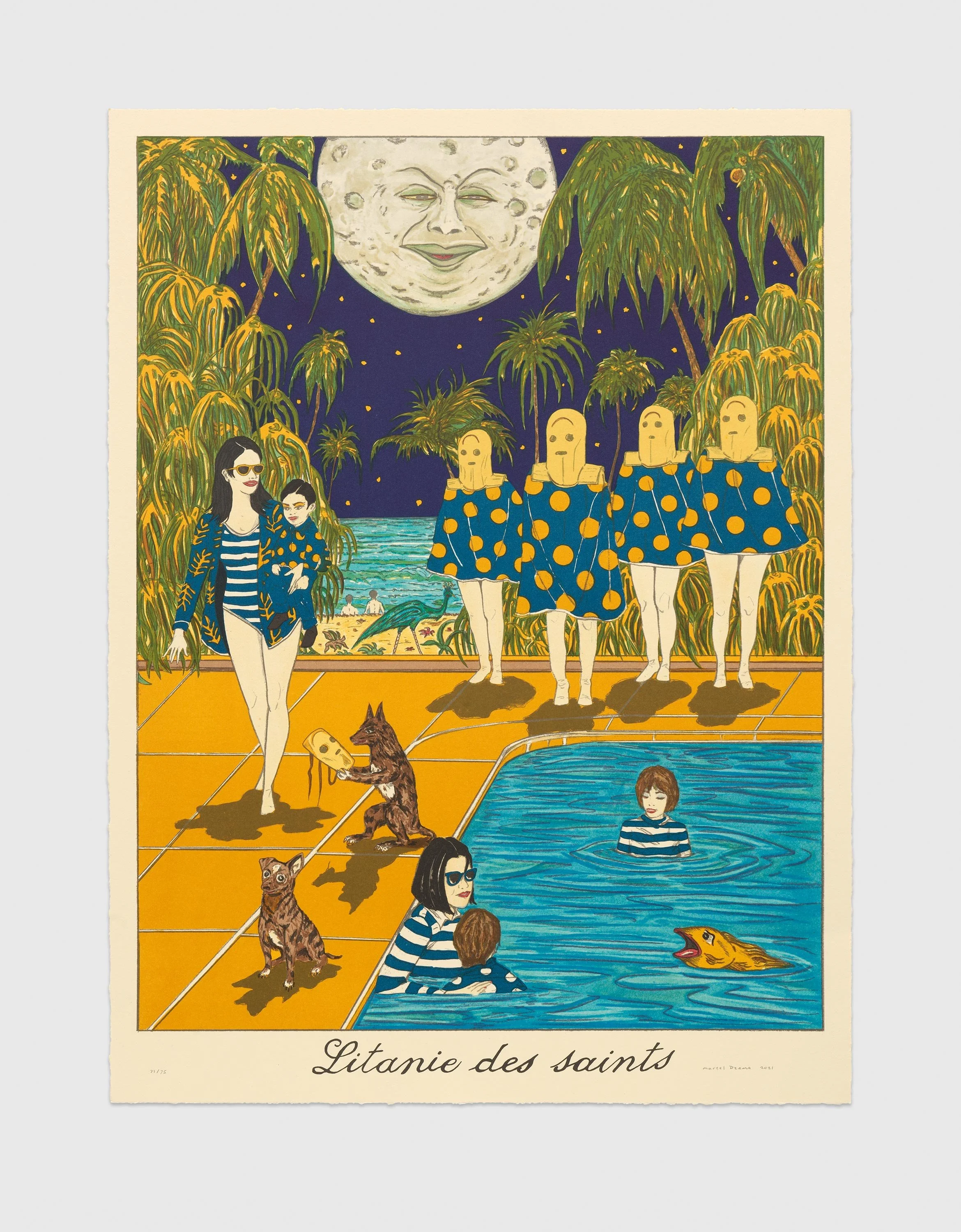 “This lithograph…was directly inspired by Dzama’s travels immediately before the start of the COVID-19 pandemic. The figures…represent the virus looming in the distance… The anthropomorphized moon recalls Georges Méliès’s A Trip to the Moon (1902)….”