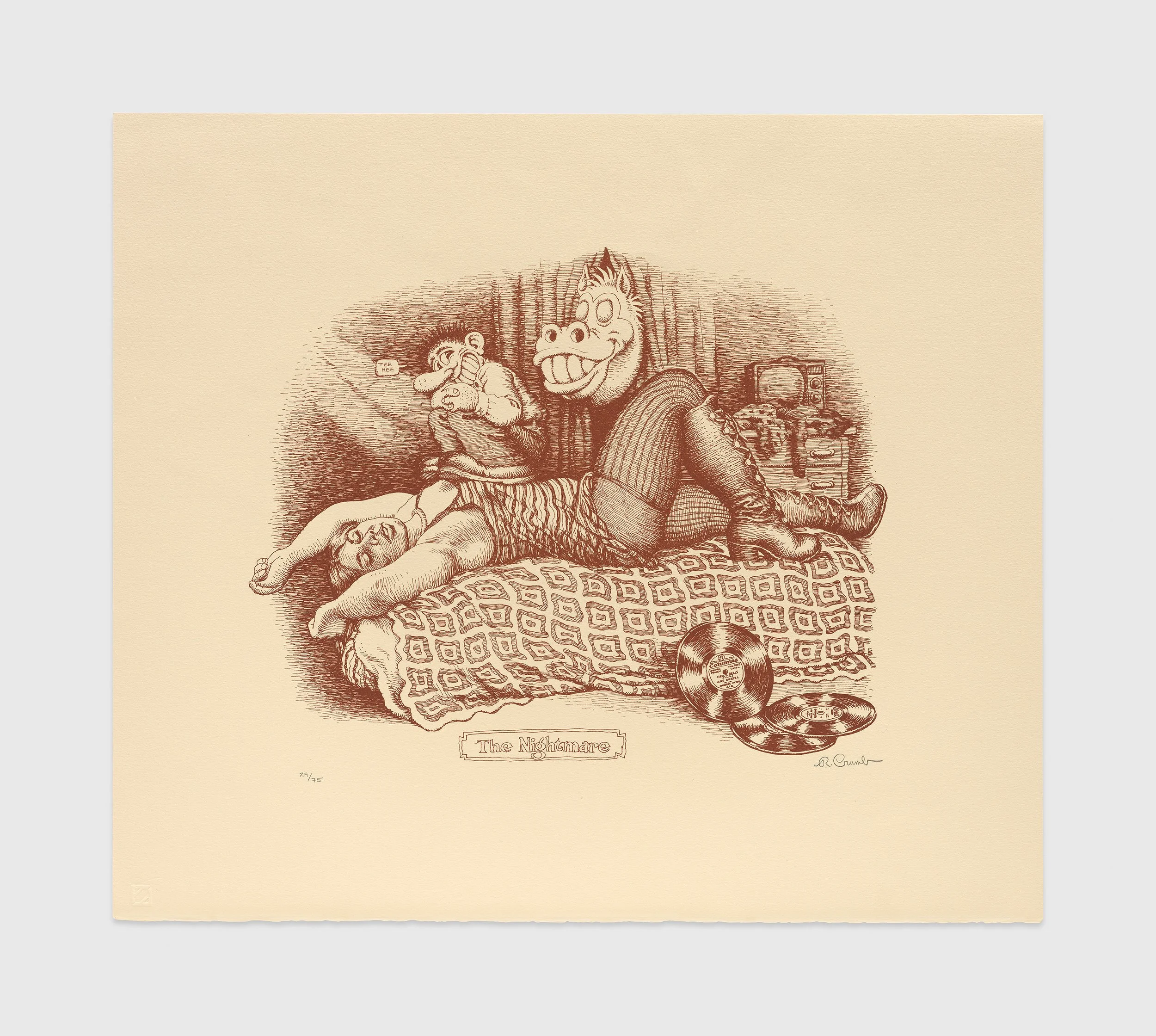 The present lithograph was published by One Step Beyond in New York. The imagery relates to a drawing by Crumb that reimagines The Nightmare (1781) by Henry Fuseli in his signature satirical style. Here, Crumb renders the slumbering female figure of Fuseli’s painting in characteristically exaggerated fashion, while the incubus looming over her is replaced by the Snoid, one of Crumb’s best-known characters, who is often portrayed as an impertinent sexual deviant.
